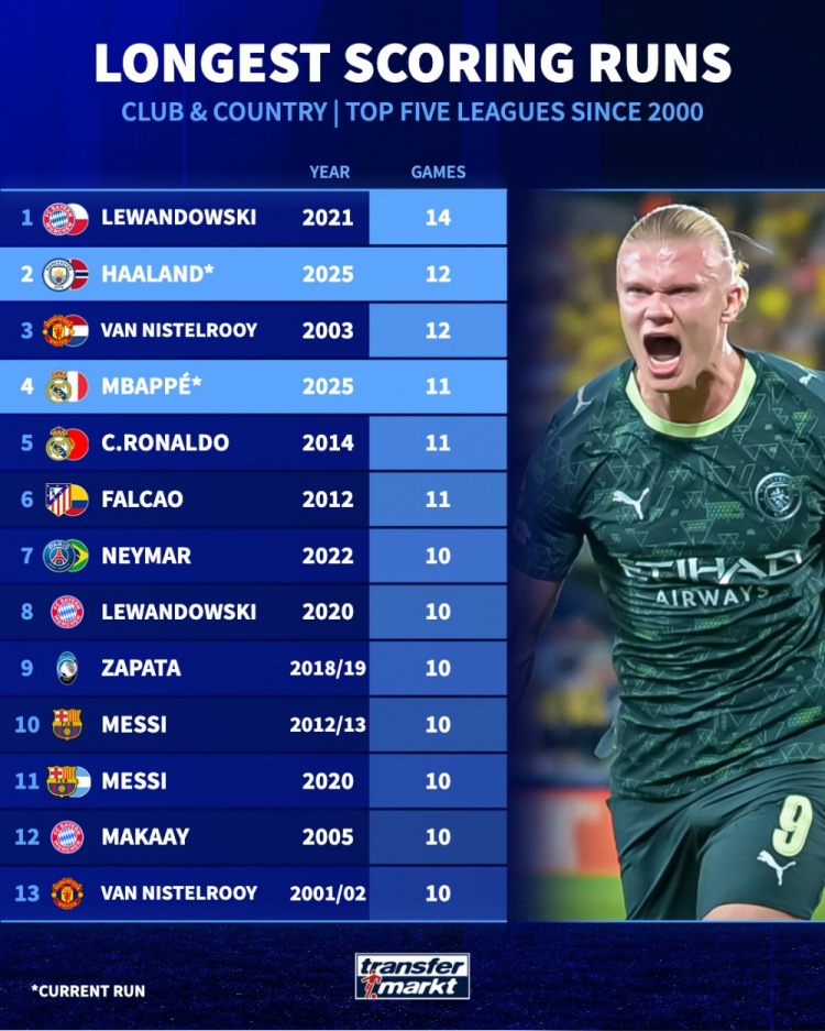 Chuỗi ghi bàn liên tiếp dài nhất trong số các cầu thủ ở 5 giải đấu lớn trong thế kỷ mới: Lewandowski 14 trận, Haaland Van Nistelrooy mỗi người 12 trận