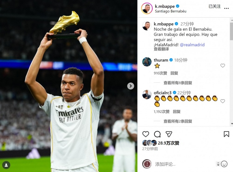 Mạng xã hội của Mpappe đăng bức ảnh khoe chiếc Chiếc giày vàng châu Âu trước trận đấu với dòng chữ: "Đó là một đêm rực rỡ ở Bernabeu. Toàn đội đã thể hiện tốt. Chúng ta phải tiếp tục duy trì điều đó! Hala Madrid!"