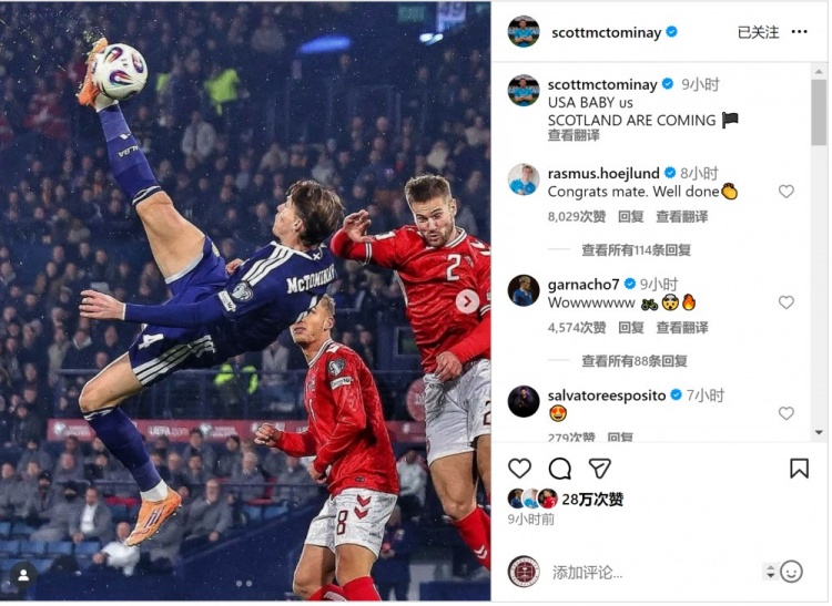 Mạng xã hội của McTominay ăn mừng việc đội tuyển tham dự World Cup với dòng chữ: "Mỹ ơi, Scotland đến rồi!"